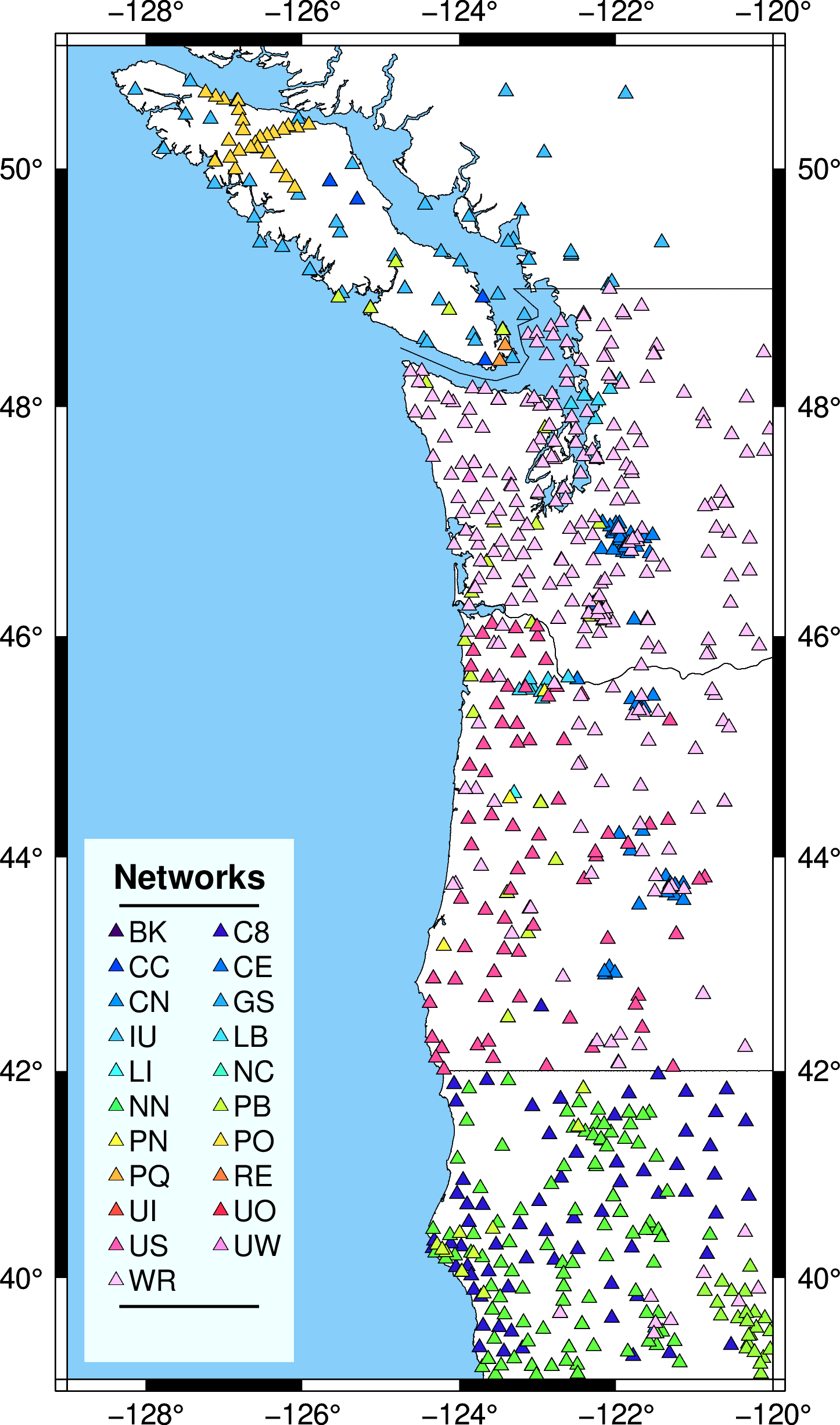 filter_stations.pyto cull duplicates and remove stations operating less than one year. The resulting station list has 806 unique entries over 21 networks saved in cascadia.stations.filtered.Edited and made map (shown below) with